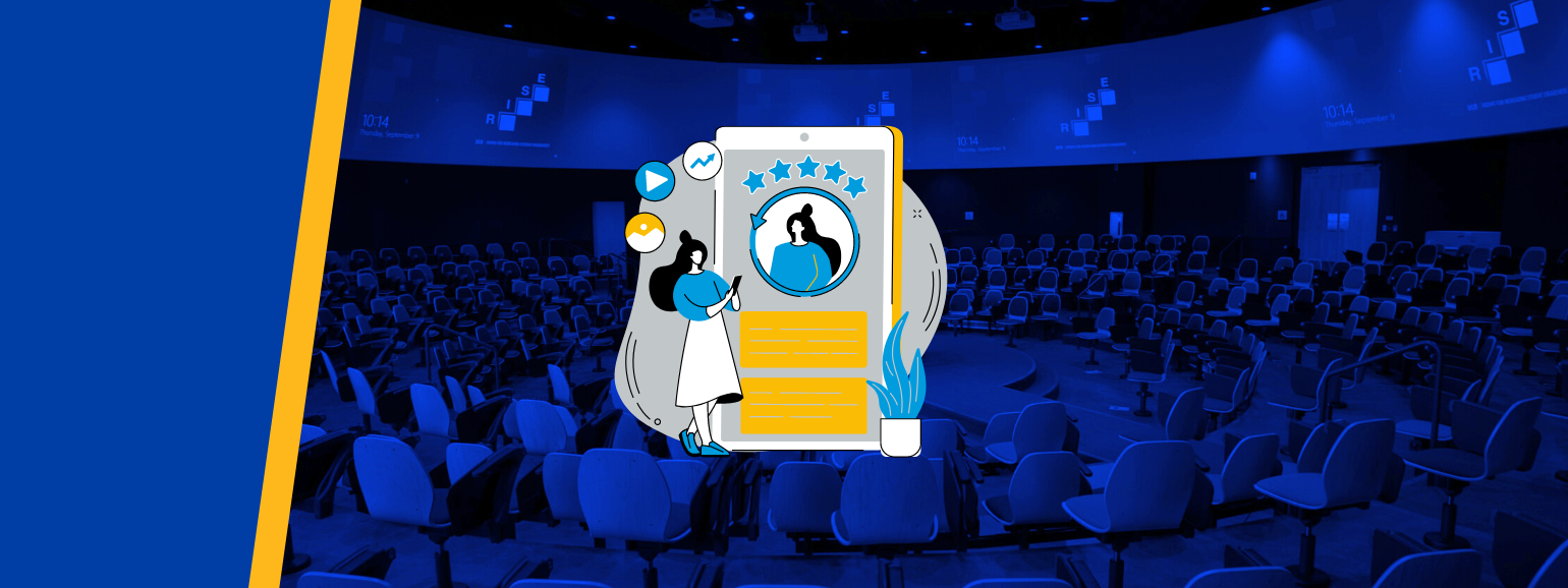 animated woman looks at profile on device