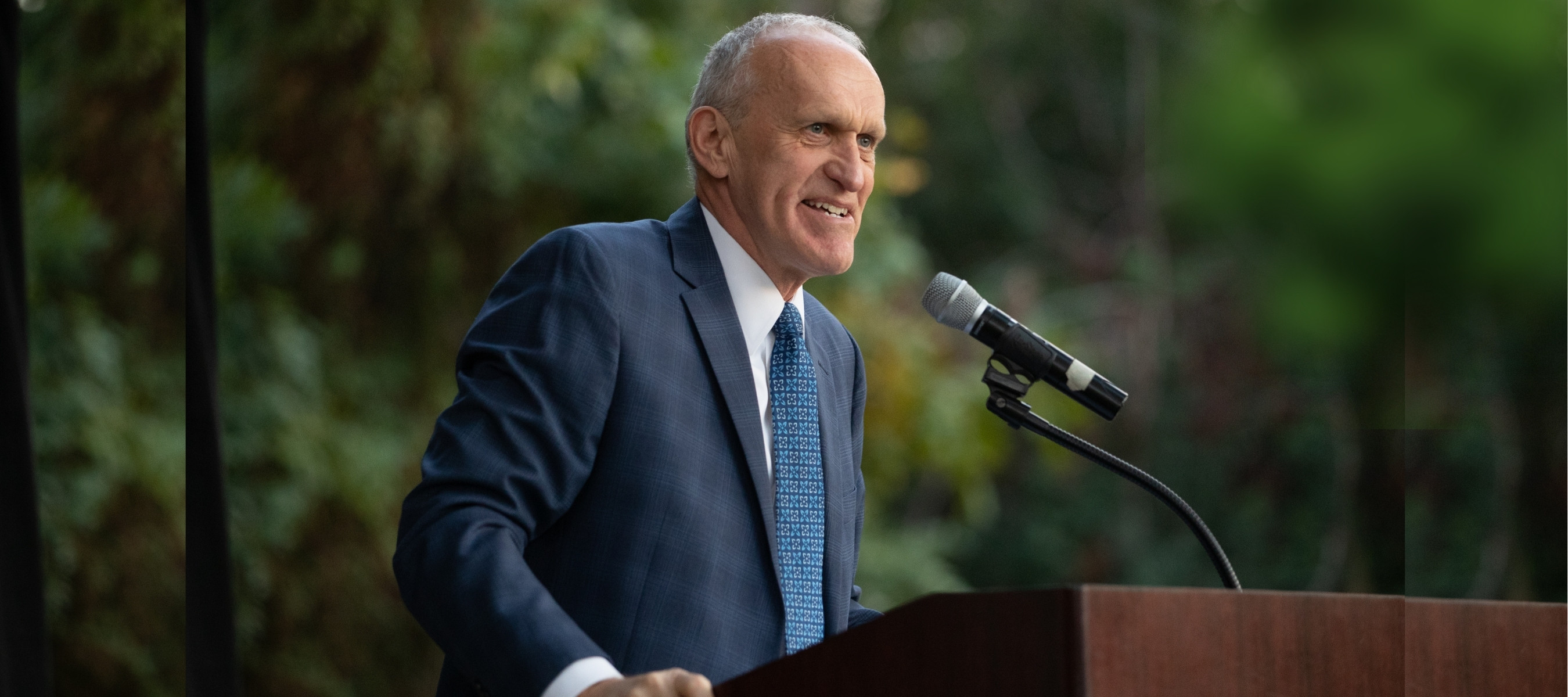 Chancellor Wilcox speaks into microphone addressing an audience
