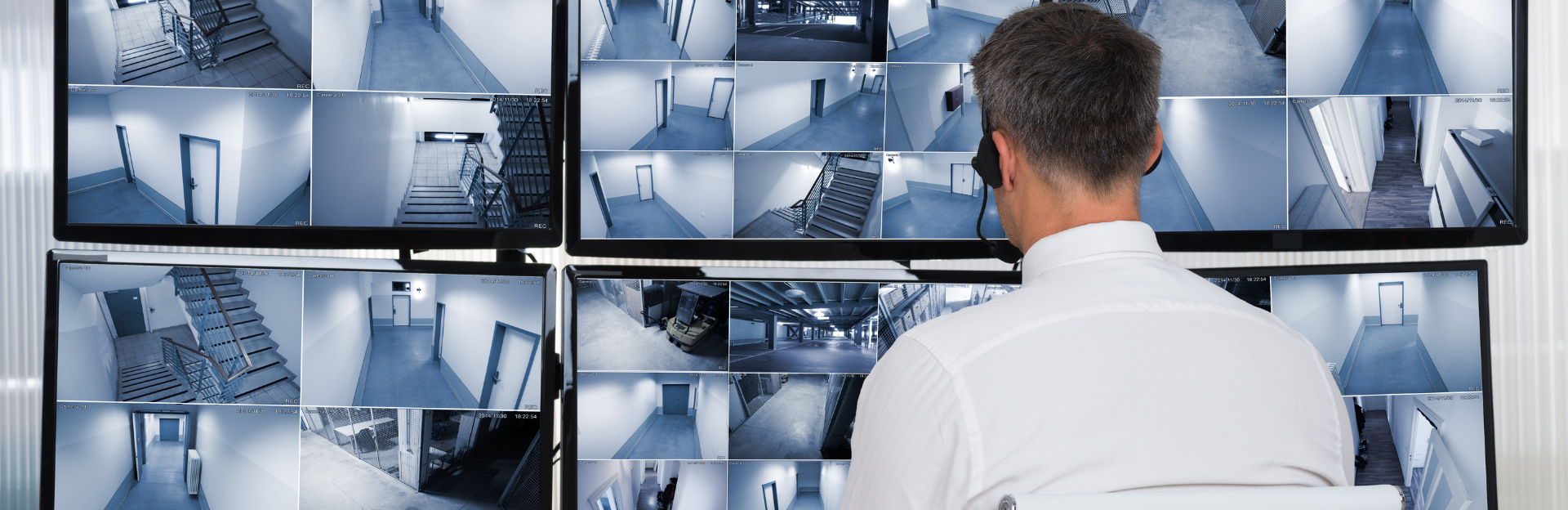 man in front of monitor watching many screens