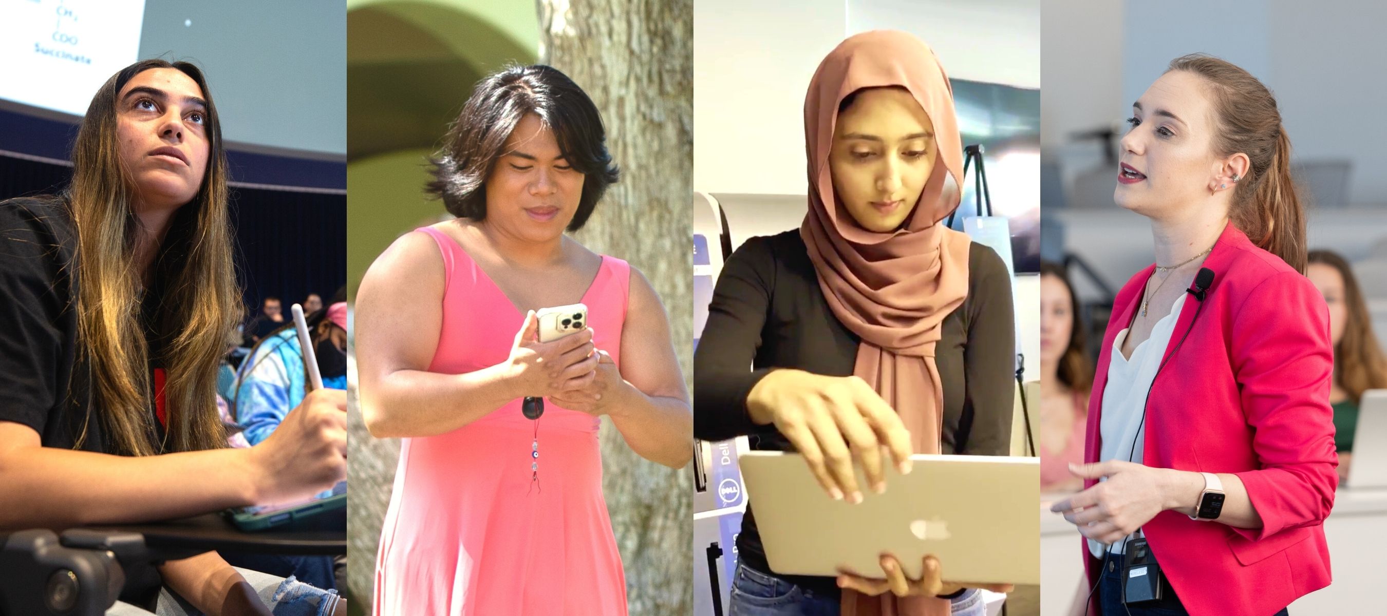 Montage shows four different people using technology on campus.