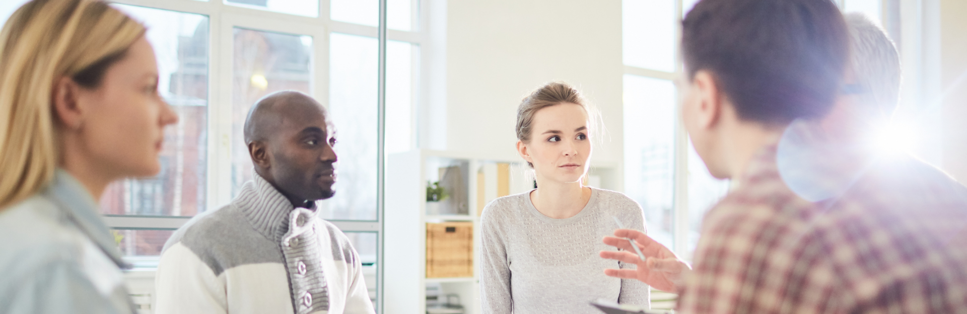 small diverse group of people in circular meeting