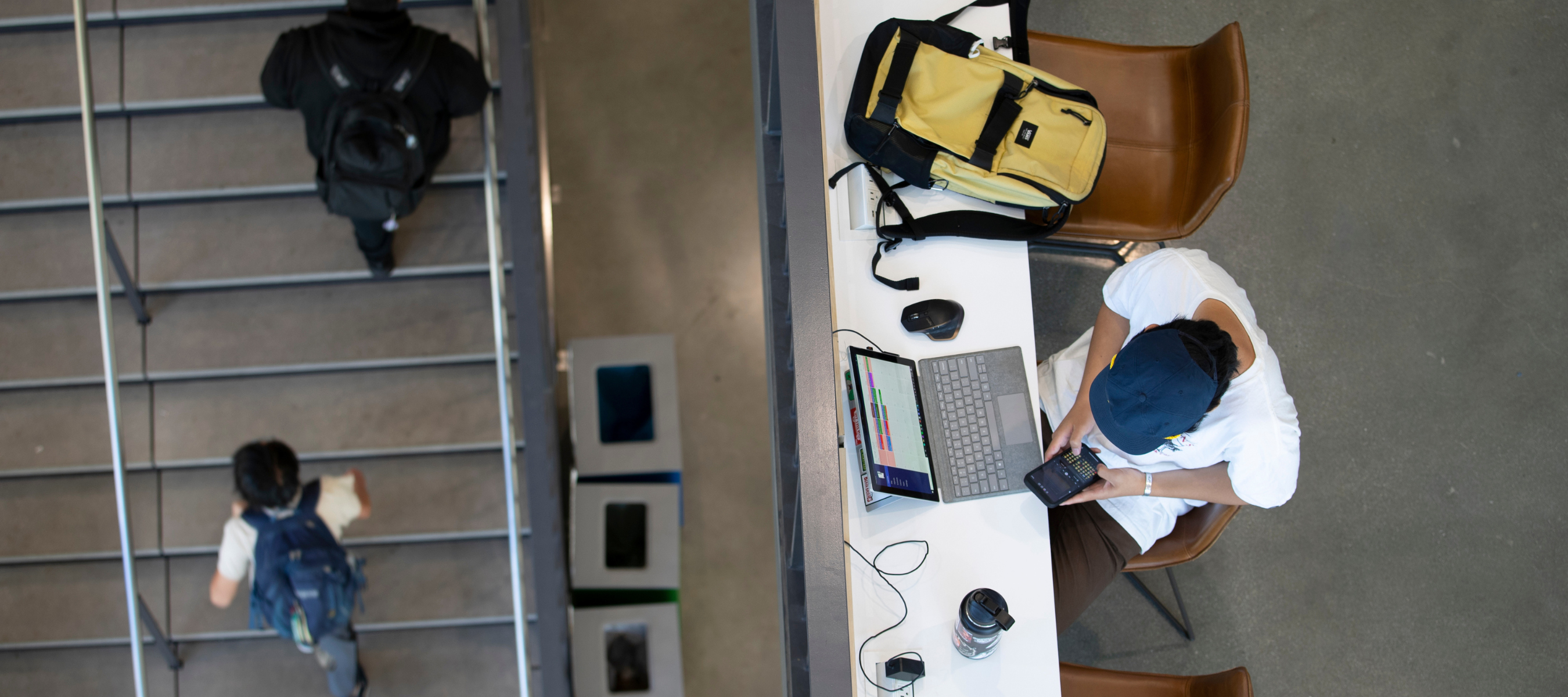 Student on laptop reviews phone while other students go up stairs.