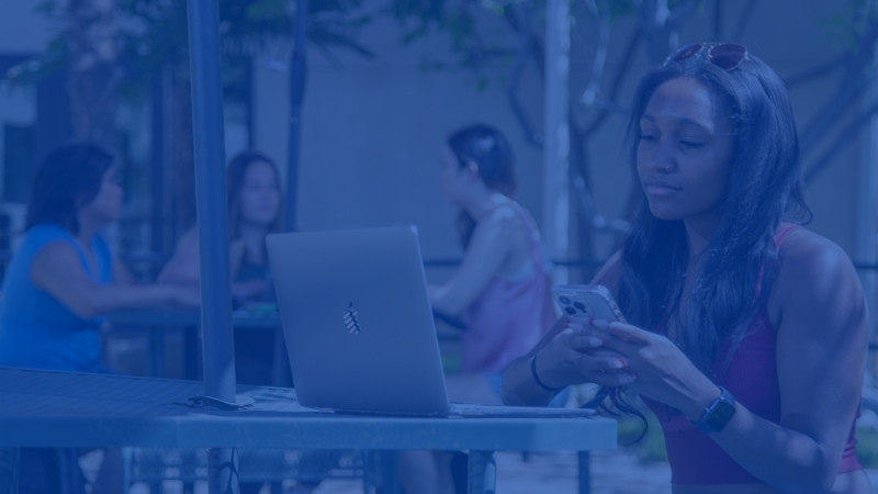 student-sitting-on-phone-with-three-students-at-table-behind-her