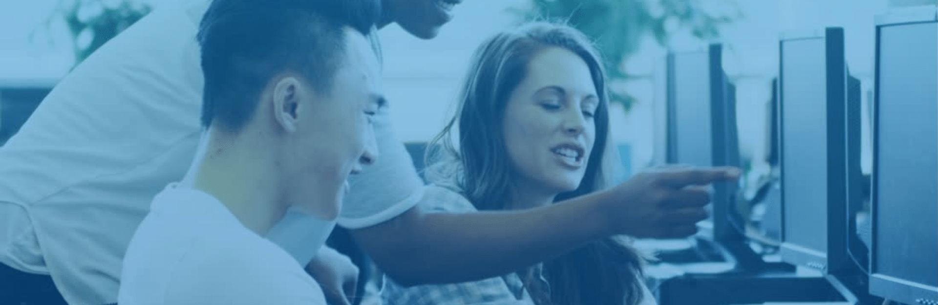 three students work at computer station
