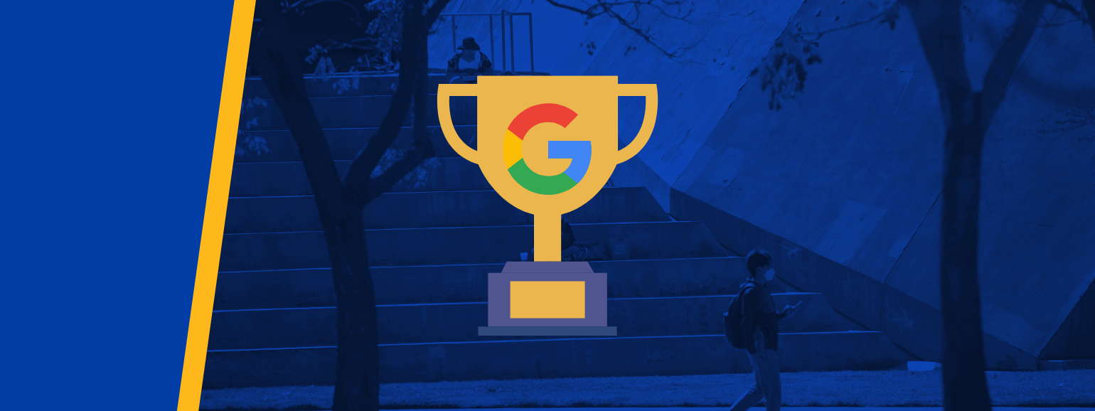 A trophy with a google logo with UCR bell tower in background