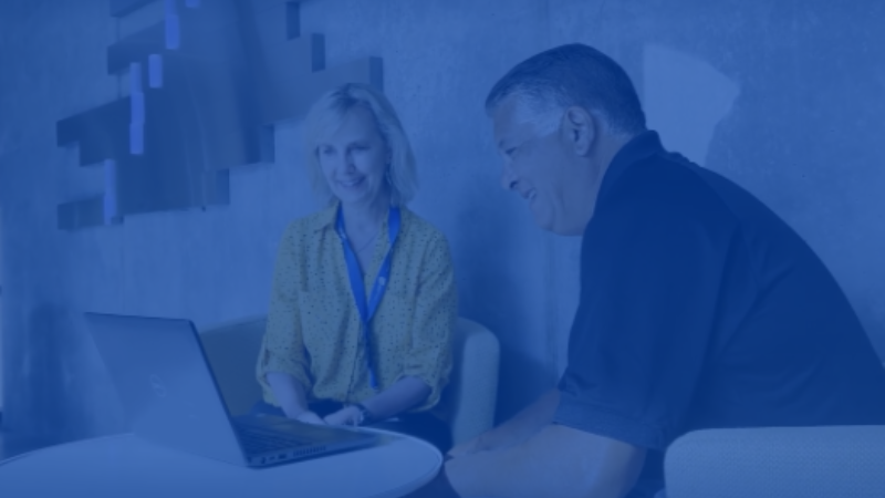 Two employees gathered by a laptop