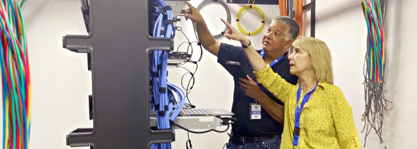 Two ITS staff technicians point at networking wires in cloud storage room